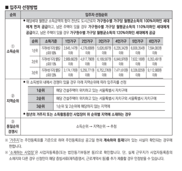 입주자 선정은 먼저 소득순위를 따지게 되고, 그 이후에 지역순위를 따지며