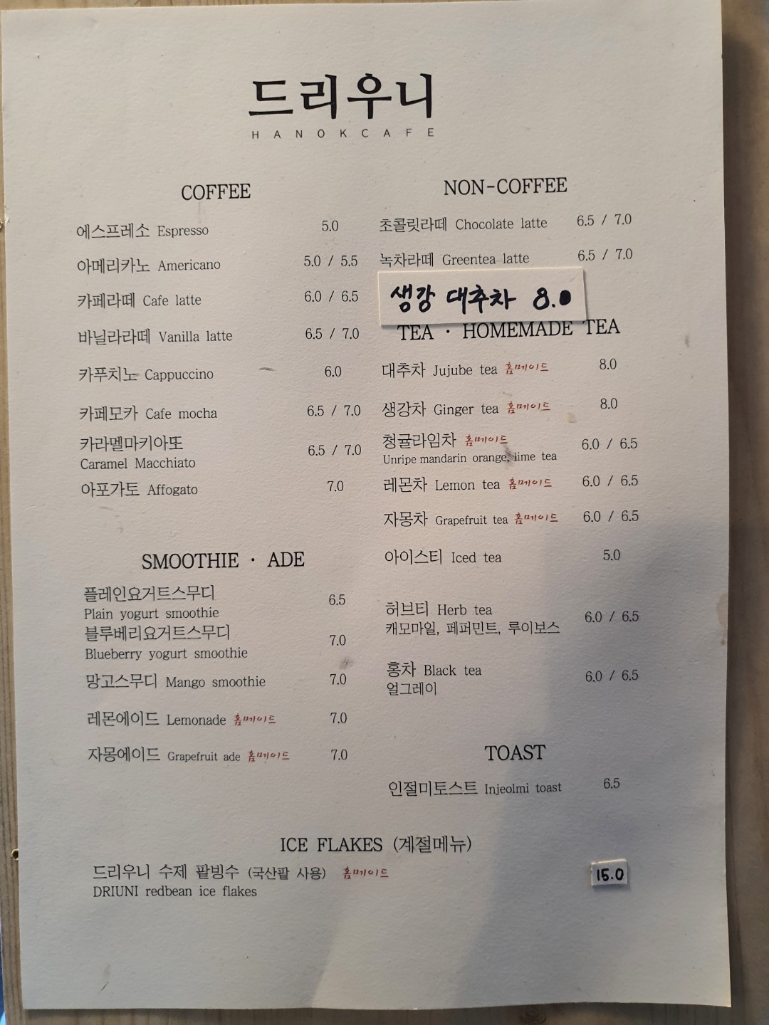 메뉴는 위의 메뉴판을 참고하시면 되겠습니다.