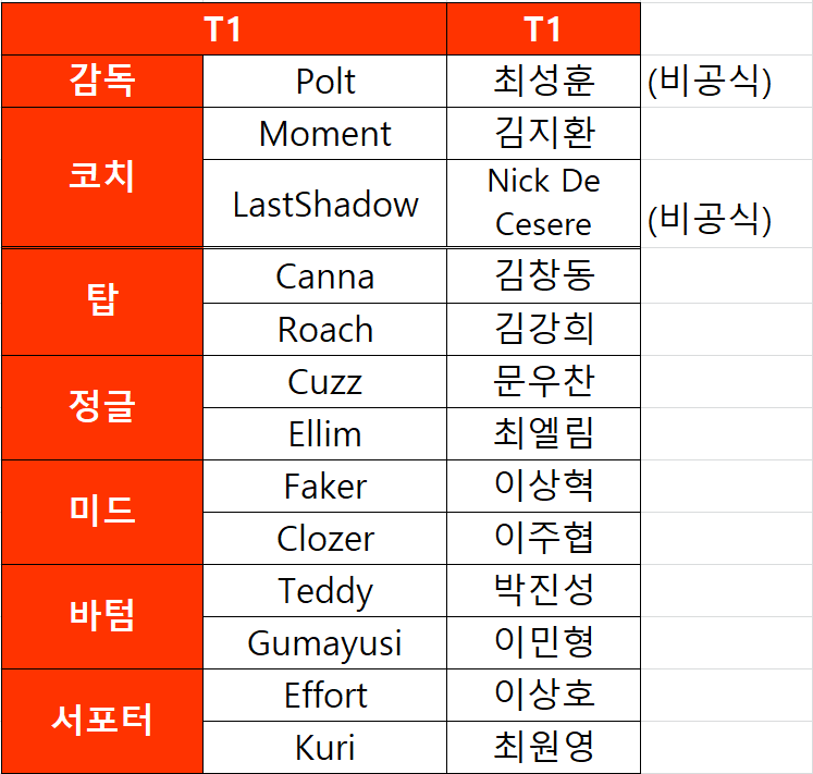 T1 로스터 다음은 T1입니다.