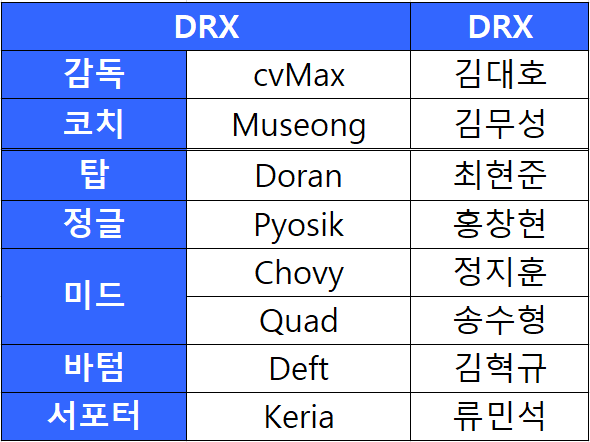 DRX 로스터 다음은 쵸비(Chovy)선수의 발언으로 이슈가 되었던 DRX입니다.