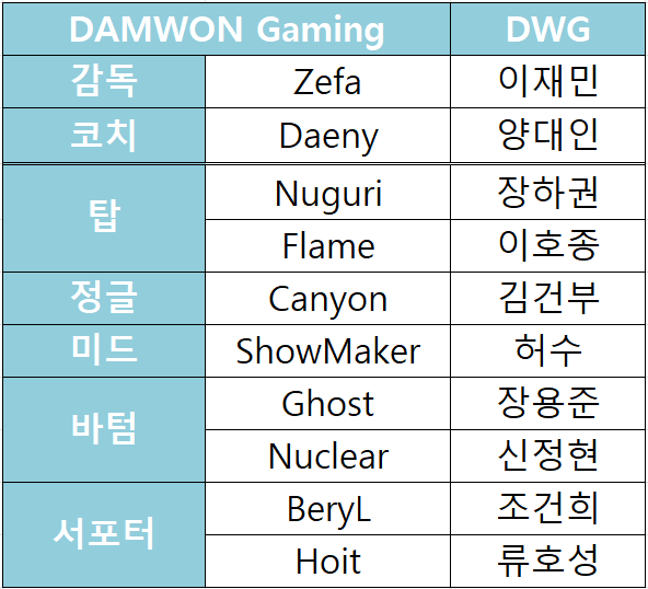 DWG 로스터 다음으로 2020년 롤드컵에서 소환사의 컵을 거머쥔 담원 게이밍입니다.