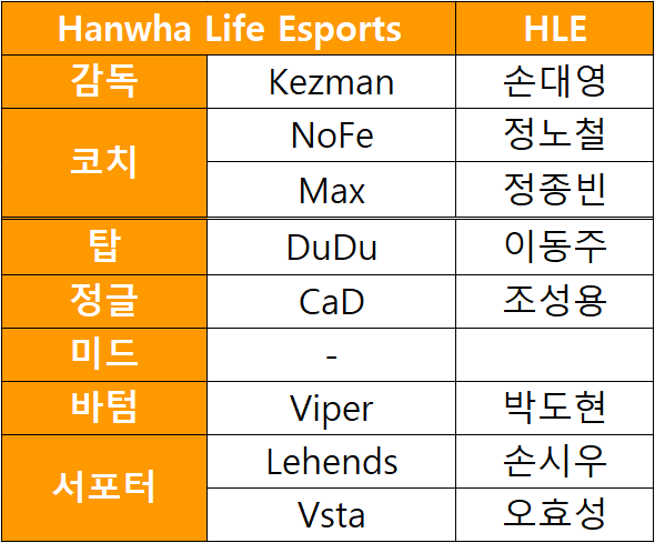 HLE 로스터 다음은 한화생명 이스포츠입니다.