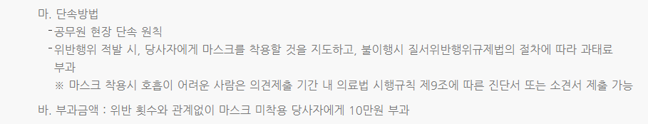 당사자에게 마스크착용을 지도한 후 불이행시 과태료가 부과된다고 하네요.