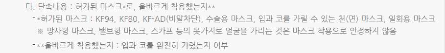 위에 언급된 허가된 마스크로 입과 코를 완전히 가리는 것까지가 단속시 확인 내용이라고 하니