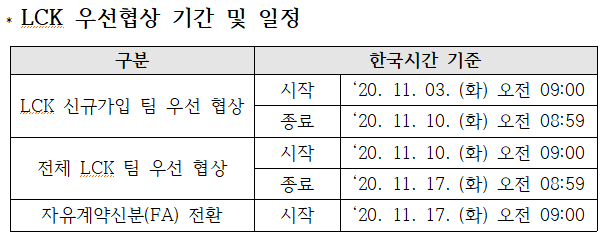 11월 3일부터 10일까지는 LCK에 신규가입 한 팀이 우선적으로 협상을 시작하게 되며
