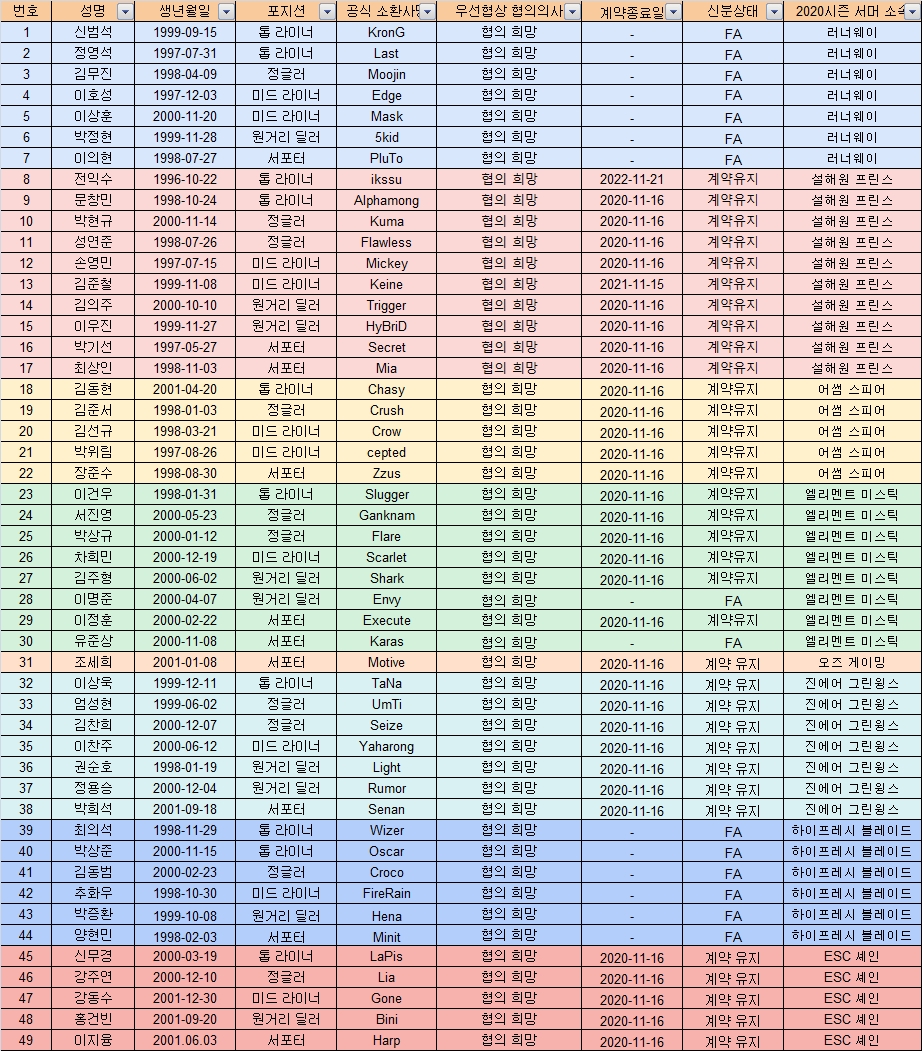 위의 표는 ()프랜차이즈 팀 및 챌린저스 팀에 소속된 우선협상 대상 리스트입니다.