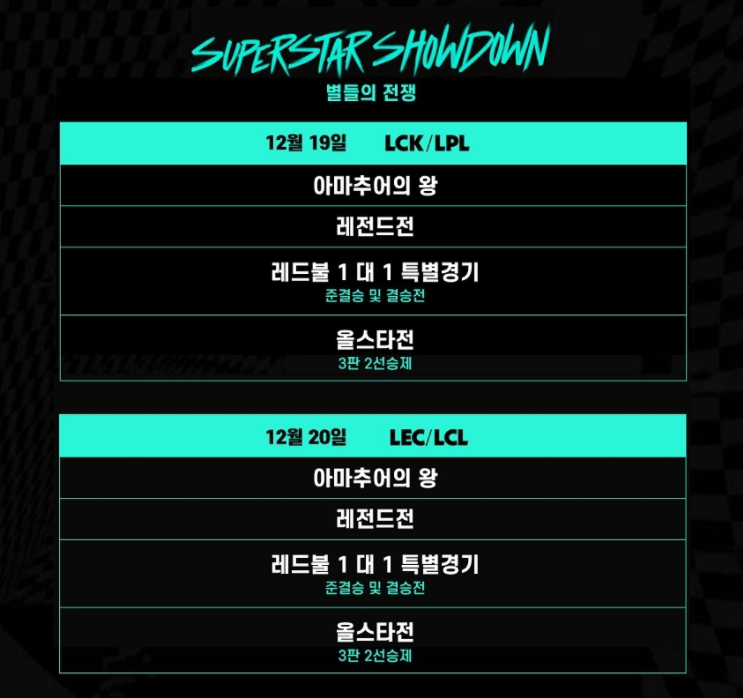 • 올스타전 - LCK와 LPL에서 최다 표를 얻은 다섯 명의 프로 선수가 펼치는 3판 2선승제 대결