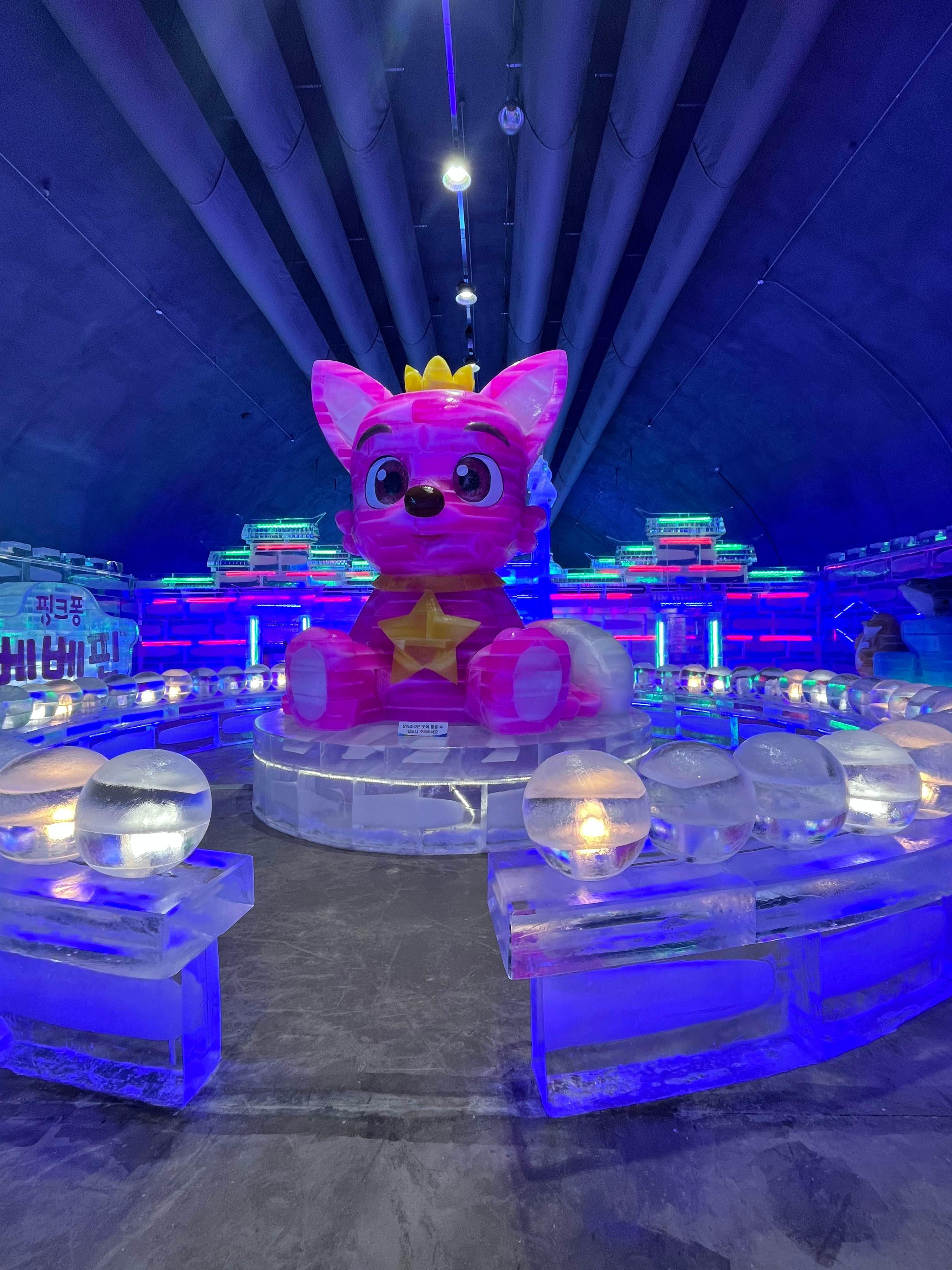 인근 산천어시네마에서는 세계최대 실내얼음조각광장이 있어 냉큼 달려갔어요.반짝반짝 빛나는 선등거리 실내얼음조각광장 입장료는 5천원이었는데,